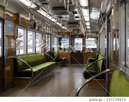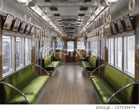 雪の中を走る電車の車内