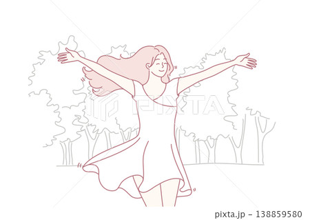 Happy woman runs through park in white flowing dress and enjoys warm summer weather. Vector image