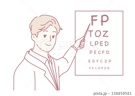 Man doctor holds out pointer to poster with letters for checking eyesight of patients. Vector image