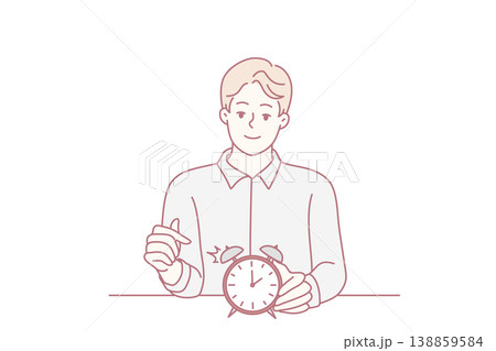 Smiling man points finger at alarm clock to remind of time management at works. Vector image