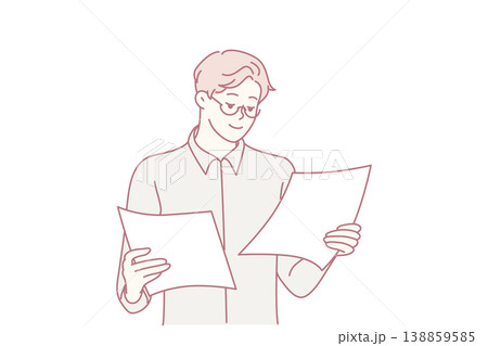 Concentrated man office worker holding two sheets of paper in hands reading report. Vector image