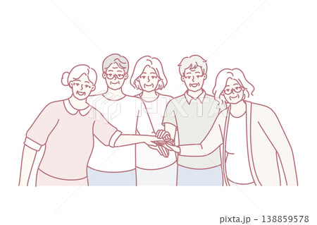 Elderly men and women with gray hair stand with their hands outstretched to center. Vector image