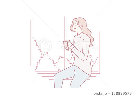 Positive girl dreaming and watching landscape through window with cup coffee in hands. Vector image