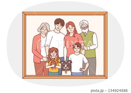 Family portrait of retirees with children and grandchildren with dog posing for memorable photo