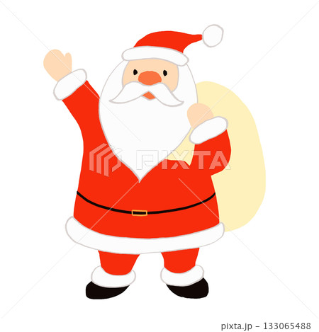プレゼントの入った袋を持ち、手をあげて挨拶するサンタクロース