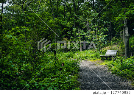 新緑の森の中のベンチと木漏れ日