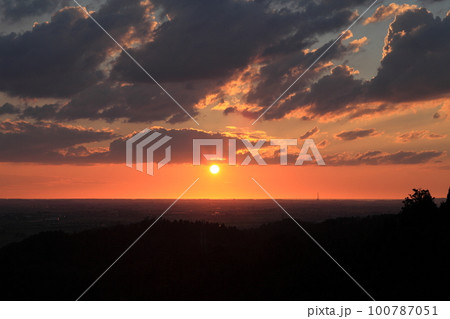 福井県坂井市丸岡 グリーンセンターウッドリームフクイRの夕日のシルエット
