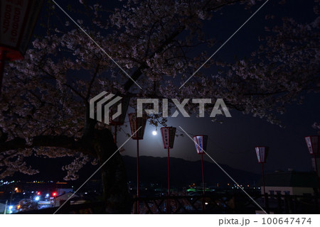 福井県 坂井市丸岡 丸岡城からの満月と桜の風景