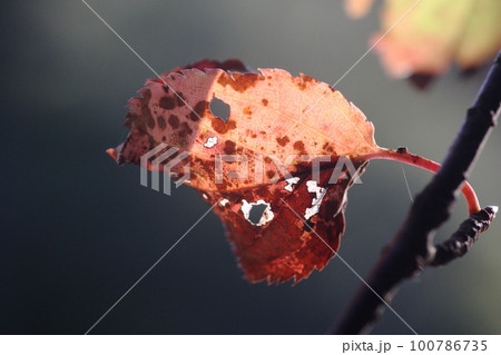 木の幹の葉っぱの影と赤くなったカエデの葉