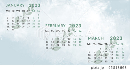 Calendar 2023 by quarters. Months January February March. Week starts on Monday.