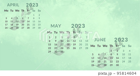 Calendar 2023 by quarters. Months april may june. Week starts on Monday.