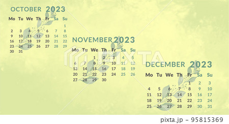 Calendar 2023 by quarter.Months october november december.Week starts on monday.