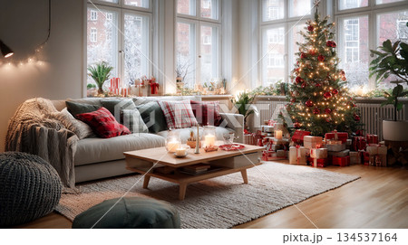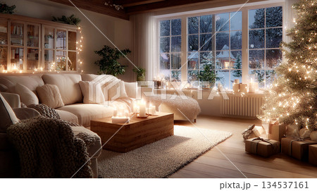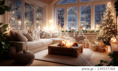 Cozy Christmas living room with a decorated pine tree and festive lights of LED garlands. This inviting home scene captures the warmth and joy of the holiday season 2026 This is AI-generated item