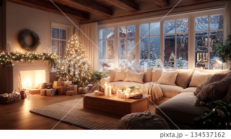 Cozy Christmas living room with a decorated tree, fireplace and festive garland lights. This inviting home scene captures the warmth and joy of the holiday season 2026. This is AI-generated item