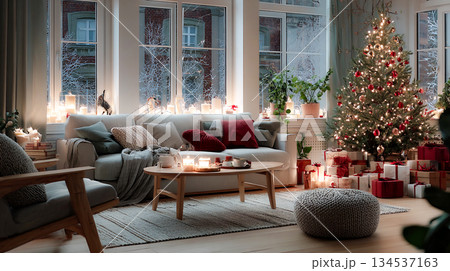 Cozy living room decorated for Christmas eve with a lit tree and wrapped gifts. A beautifully decorated space at home with a Christmas tree, presents, and a warm,This is AI-generated item