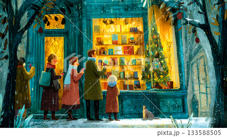 People admiring a Christmas display at a bookstore in winter. A charming illustration depicts a group of people gazing at a store window adorned with garlands This is AI-generated item