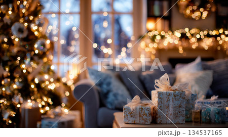 Cozy Christmas scene with gifts, tree, and warm lights in a living room. This festive image captures the joy of the holiday season with beautifully wrapped presents This is AI-generated item