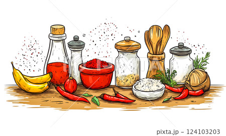 Doodle style illustration with glass bottles with salt, pepper, herbs and spices for cooking on isolated white background. Organic food collection. This is AI-generated item