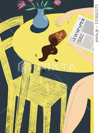 Illustration of spilled coffee on a yellow table with a newspaper and flowers in a vase. A spill coffee on a yellow table next to magazine and flowers