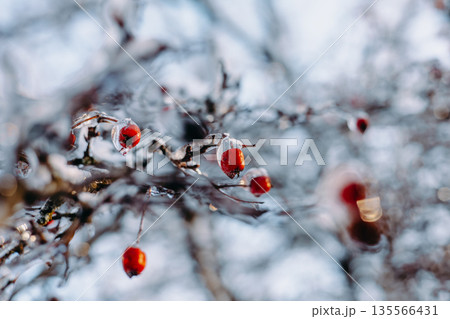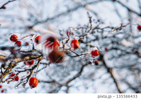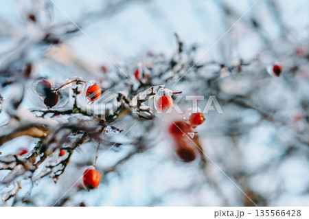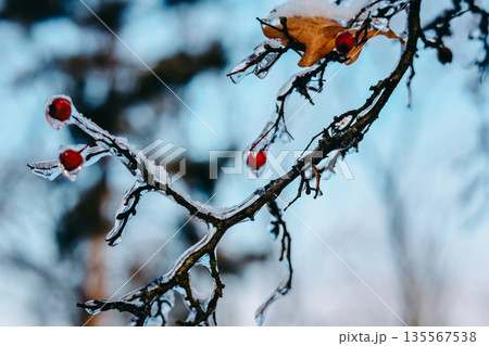 Frozen tree branch with red berries covered in ice and snow against soft blue winter trees background. Wintertime nature detail, cold weather scene.