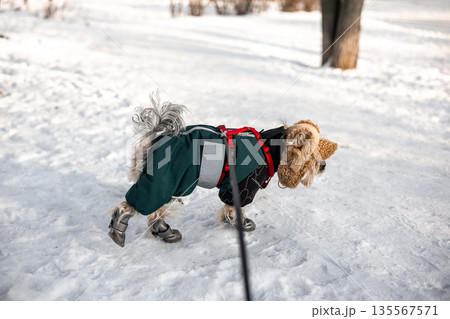 Yorkshire Terrier dressed in warm winter clothing and boots walking outdoors on snowy ground. Small dog on leash on a winter walk. Winter pet.