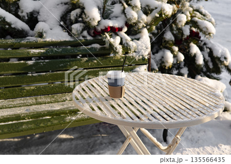 Hot takeaway coffee on a snowy outdoor table in winter park. Cozy winter morning concept, warm drink during cold weather. Cafe or coffee shop terrace