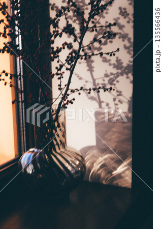 Minimalist interior still life featuring a transparent glass vase with red berry branches placed on a windowsill. Warm natural sunlight creates an elegant play of shadows and light play on the wall.