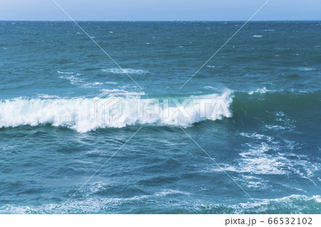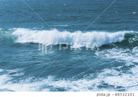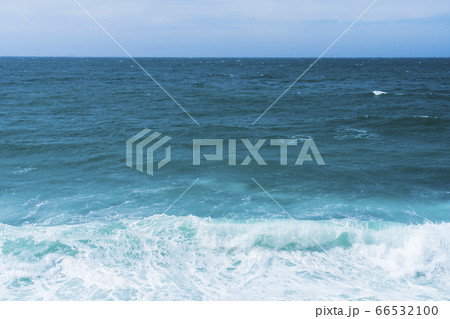 糸島市二見ヶ浦の青い海と白い波しぶきと水平線