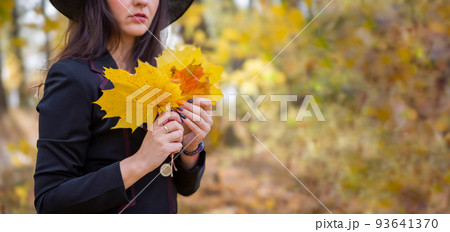 lovely autumn banner. young woman in black holds golden maple leaves in her hands. portrait without face