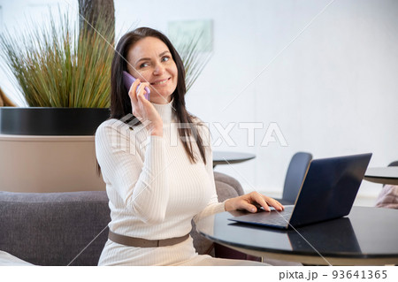 beautiful mid adult woman typing smartphone sitting by laptop in open space office