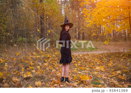 woman in witch costume with broom walking on covered with falling autumn leaves Halloween day forest