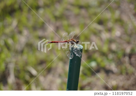 秋の使者: アキアカネのひと休み 透明な翅が光を反射し、赤い胴体が印象的