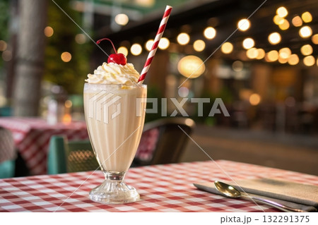 Milkshake with whipped cream and cherry on table at restaurant