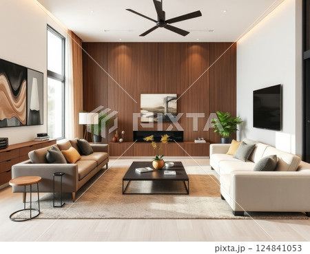 Modern living room with bright color and wood wall