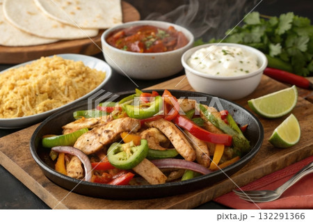 Chicken fajitas in iron plate and some side dish