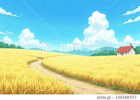 Anime style of rice field with farm house blue sky