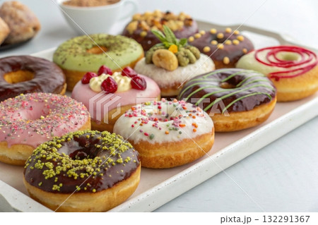 Assorted donuts on ceramic tray