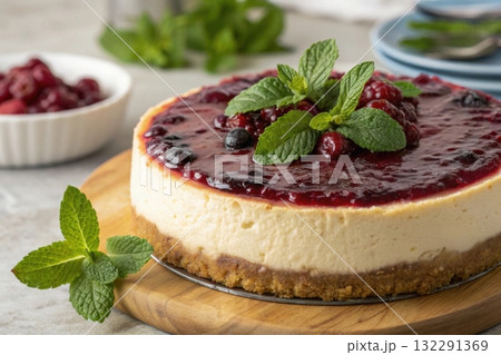 Blueberry and raspberry cheesecake on wood plate