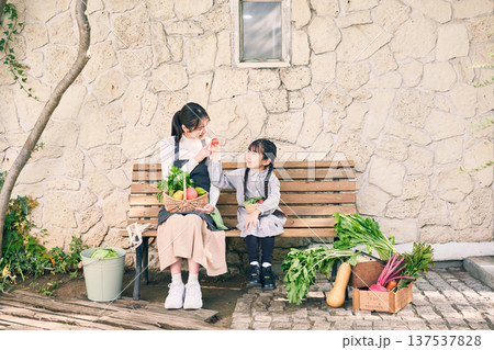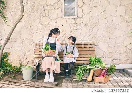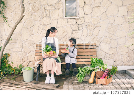 野菜を持ってベンチに座っている親子