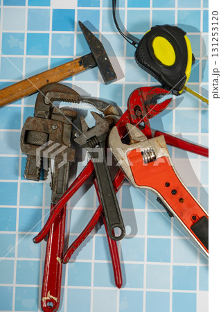 Plumbing tools lying on blue tiles ready for home improvement repairing