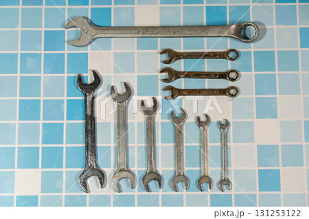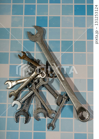 Wrenches and spanners lying on blue tiled surface