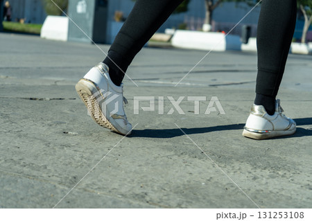 Woman walking on concrete surface wearing white sneakers and black leggings
