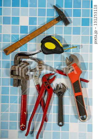 Plumbing tools lying on blue tiles getting ready for work
