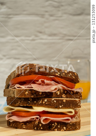 Delicious ham and tomato sandwich with whole wheat bread and orange juice for breakfast