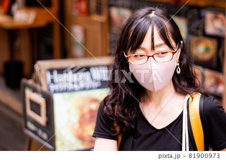 マスクとメガネの女性が飲食店から出てきたところ