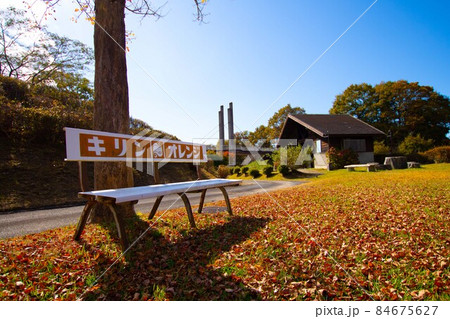 青空の下の紅葉の落ち葉とベンチ