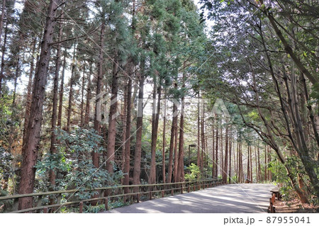 カーブした道の並木道(横)