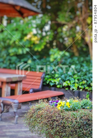 テラス近くの鉢に咲くパンジー(縦)