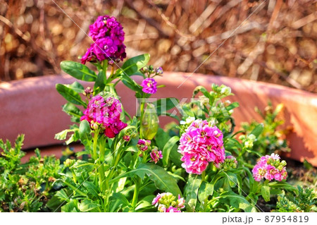 鉢に咲くピンク色の花のズームアップ