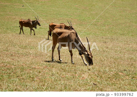 Three oryx grazing on the savannah in the sun